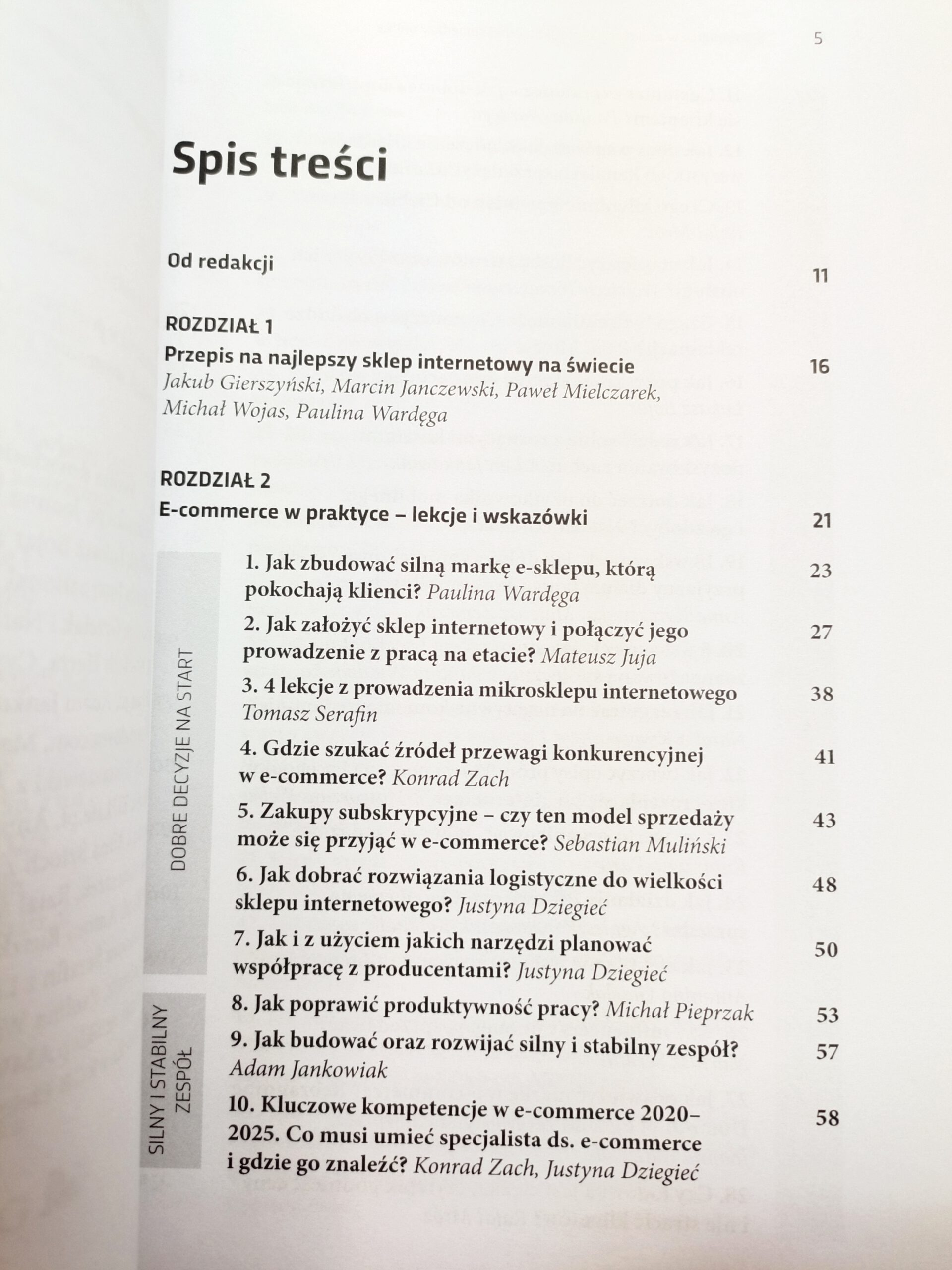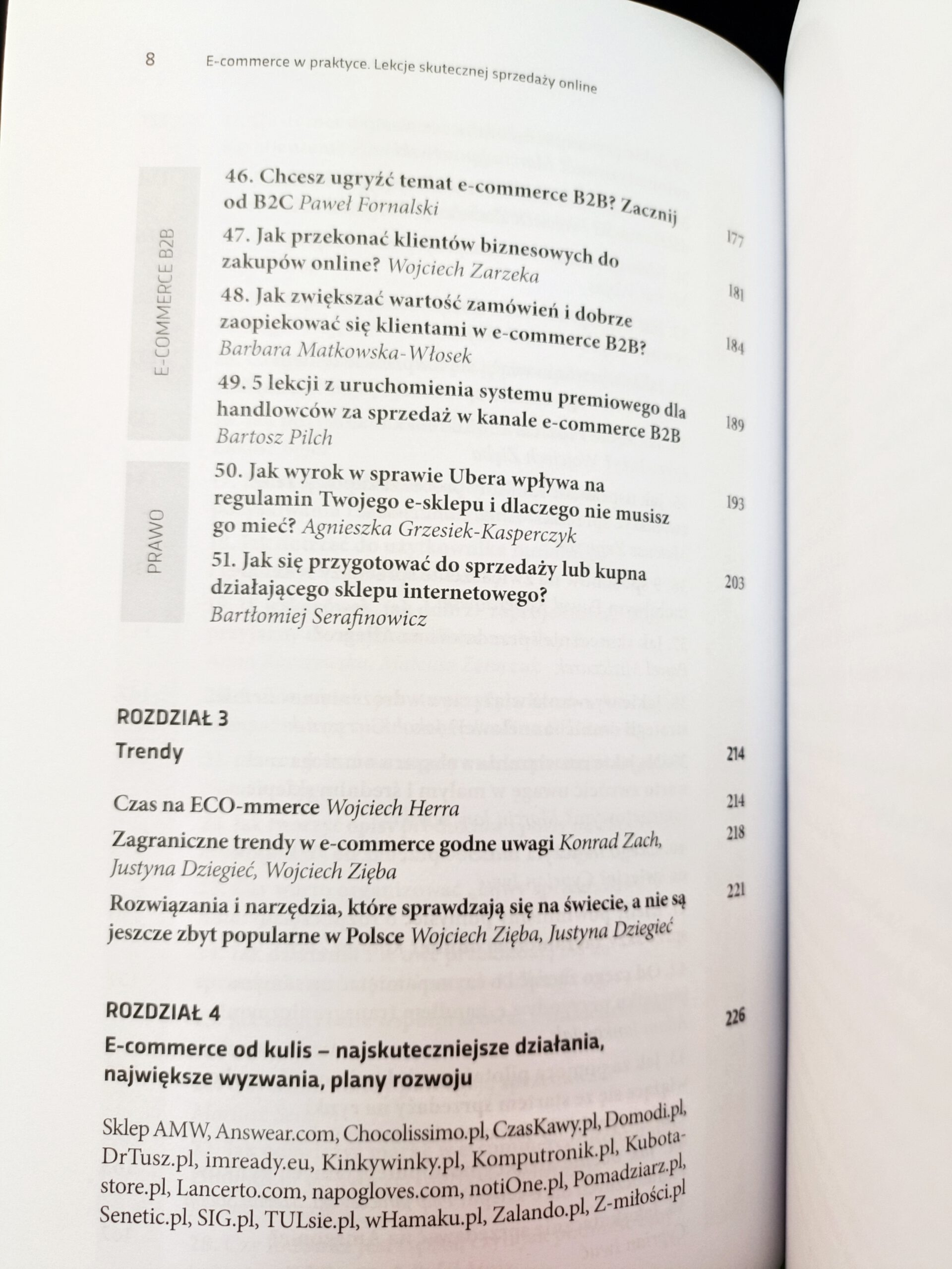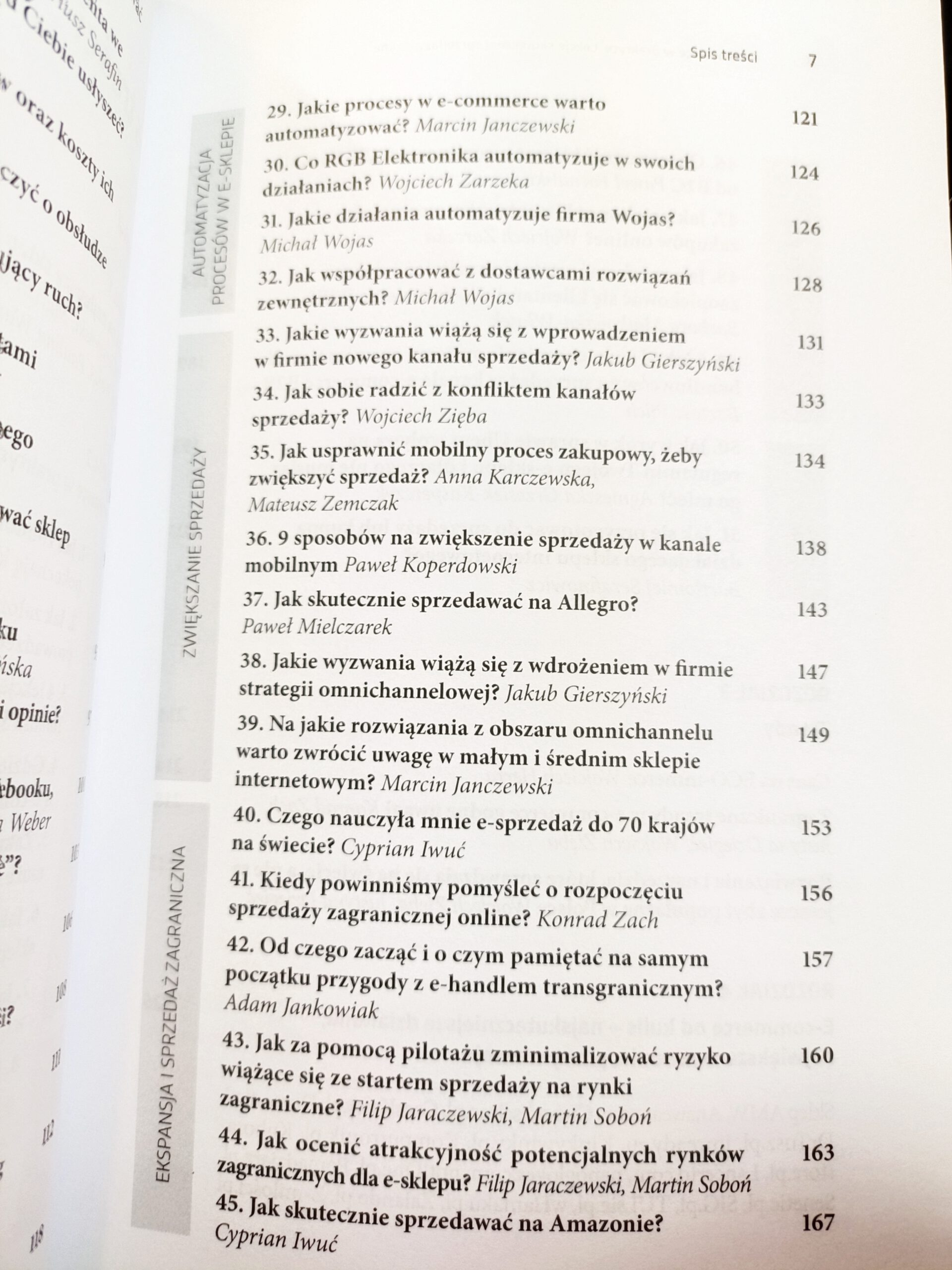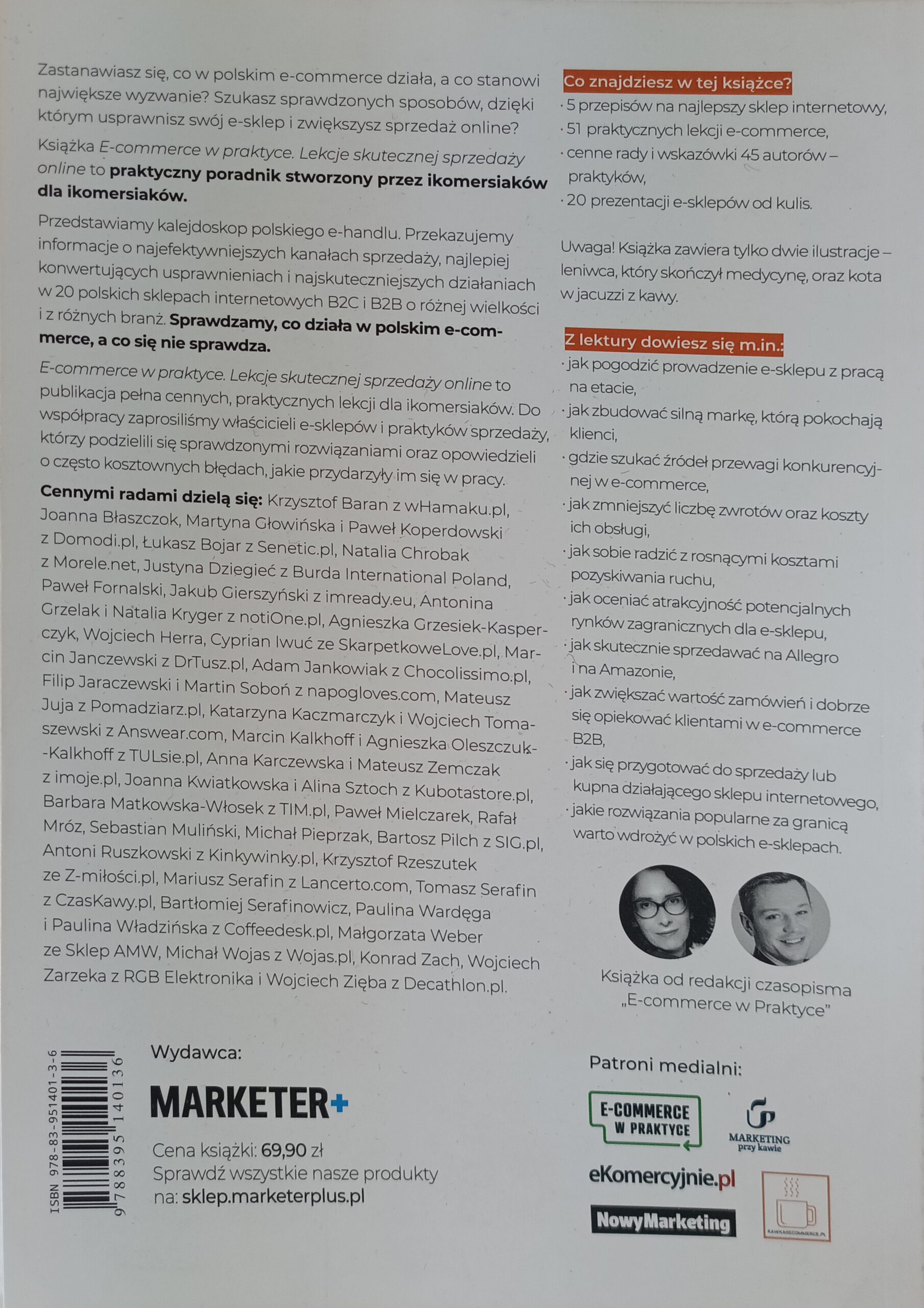 Do współpracy zaprosiliśmy właścicieli e-sklepów i praktyków sprzedaży. Efektem jest publikacja pełna cennych, praktycznych lekcji i wskazó-wek dla ikomersiaków. Swoim doświadczeniem dzielą się: Krzysztof Baran z wHamaku.pl, Joanna Błaszczok, Martyna Głowińska i Paweł Koperdowski z Domodi.pl. Łukasz Bojar z Senetic.pl, Natalia Chrobak z Morele.net, Justyna Dziegieć z Burda International Poland, Paweł Fornalski, Jakub Gierszyński z imready.eu, Antonina Grzelak i Natalia Kryger z notiOne.pl, Agnieszka Grzesiek-Kasperczyk, Wojciech Herra, Cyprian Iwuć ze SkarpetkoweLove.pl. Marcin Janczewski z DrTusz.pl, Adam Jankowiak z Chocolissimo.pl, Filip Jaraczewski i Martin Soboń z napogloves.com, Mateusz Juja z Pomadziarz.pl. Katarzyna Kaczmarczyk i Wojciech Tomaszewski z Answear.com, Marcin Kalkhoff i Agnieszka Oleszczuk-Kalkhoff z TULsie.pl, Anna Karczewska i Mateusz Zemczak z imoje.pl, Joanna Kwiatkowska i Alina Sztoch z Kubota- store.pl, Barbara Matkowska-Włosek z TIM.pl, Paweł Mielczarek, Rafał Mróz, Sebastian Muliński, Michał Pieprzak, Bartosz Pilch z SIG.pl, Antoni Rusz- kowski z Kinkywinky.pl, Krzysztof Rzeszutek ze Z-miłości.pl, Mariusz Sera- fin z Lancerto.com, Tomasz Serafin z CzasKawy.pl, Bartłomiej Serafinowicz, Paulina Wardęga i Paulina Władzińska z Coffeedesk.pl, Małgorzata Weber ze Sklep AMW, Michał Wojas z Wojas.pl, Konrad Zach, Wojciech Zarzeka z RGB Elektronika i Wojciech Zięba z Decathlon.pl.