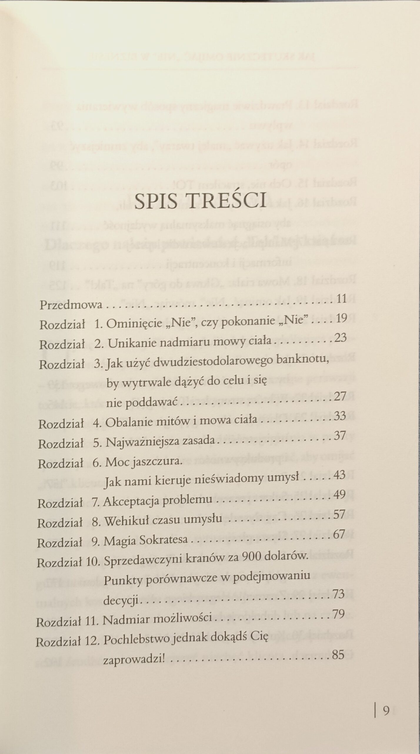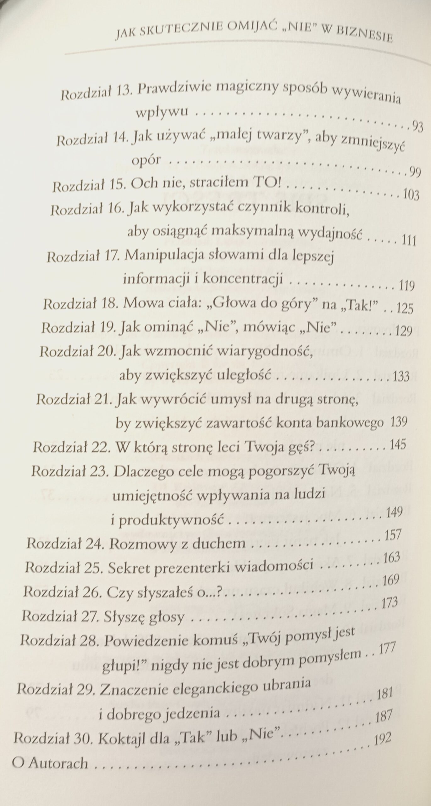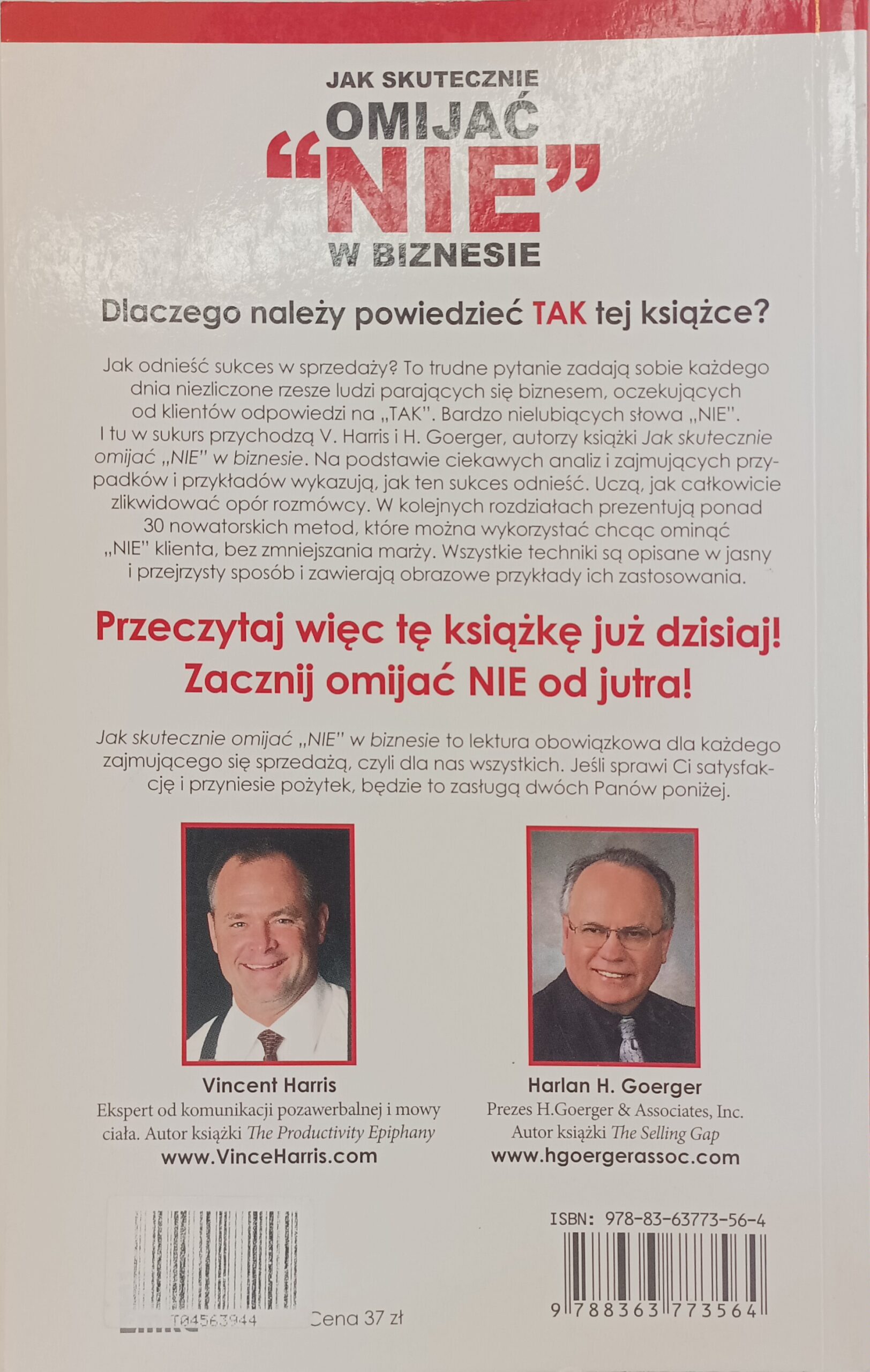 Ta niezwykle praktyczna książka to doskonały przewodnik dla wszystkich, którzy chcą poprawić swoje umiejętności negocjacyjne i skutecznie omijać odmowy w biznesie. Autorzy, Vincent Harris i Harlan H. Goerger, są doświadczonymi trenerami i mówcami, specjalizującymi się w mowie ciała i strategiach wpływu na ludzi. Ich książka powstała na bazie 20 lat doświadczeń i badań, a w jej treści znajduje się 30 rozdziałów, każdy zawierający nowatorskie metody, które mogą pomóc w zmniejszeniu częstotliwości odpowiedzi „nie” w kontaktach biznesowych.