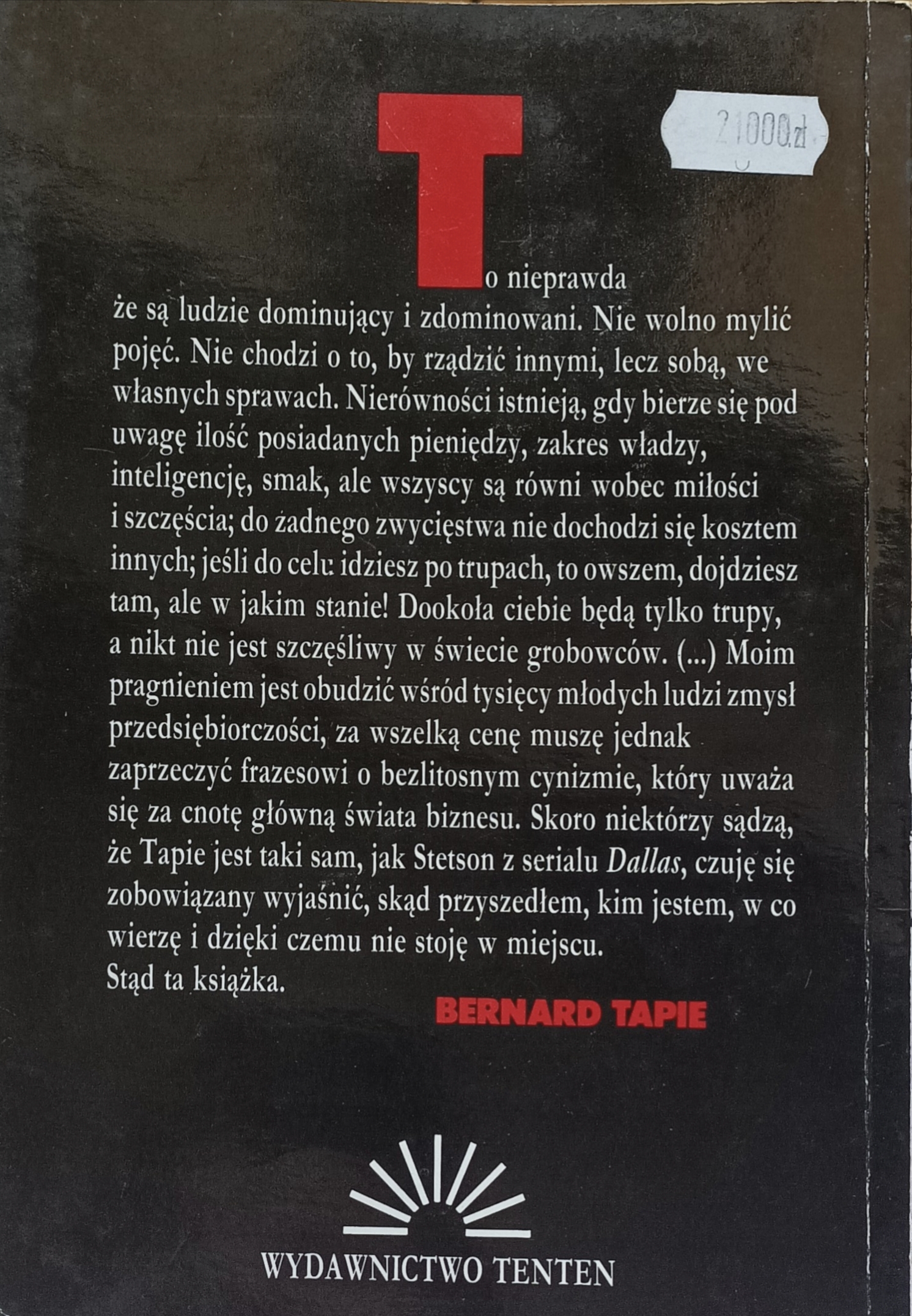 Ta książka to połączenie biografii i poradnika biznesowego. Tapie dzieli się nie tylko wspomnieniami, ale przede wszystkim praktycznymi wskazówkami, jak osiągać cele, nie zatracając siebie i swoich wartości. To lektura dla tych, którzy szukają motywacji, chcą rozwinąć przedsiębiorczość i nauczyć się zarządzać własnym życiem.