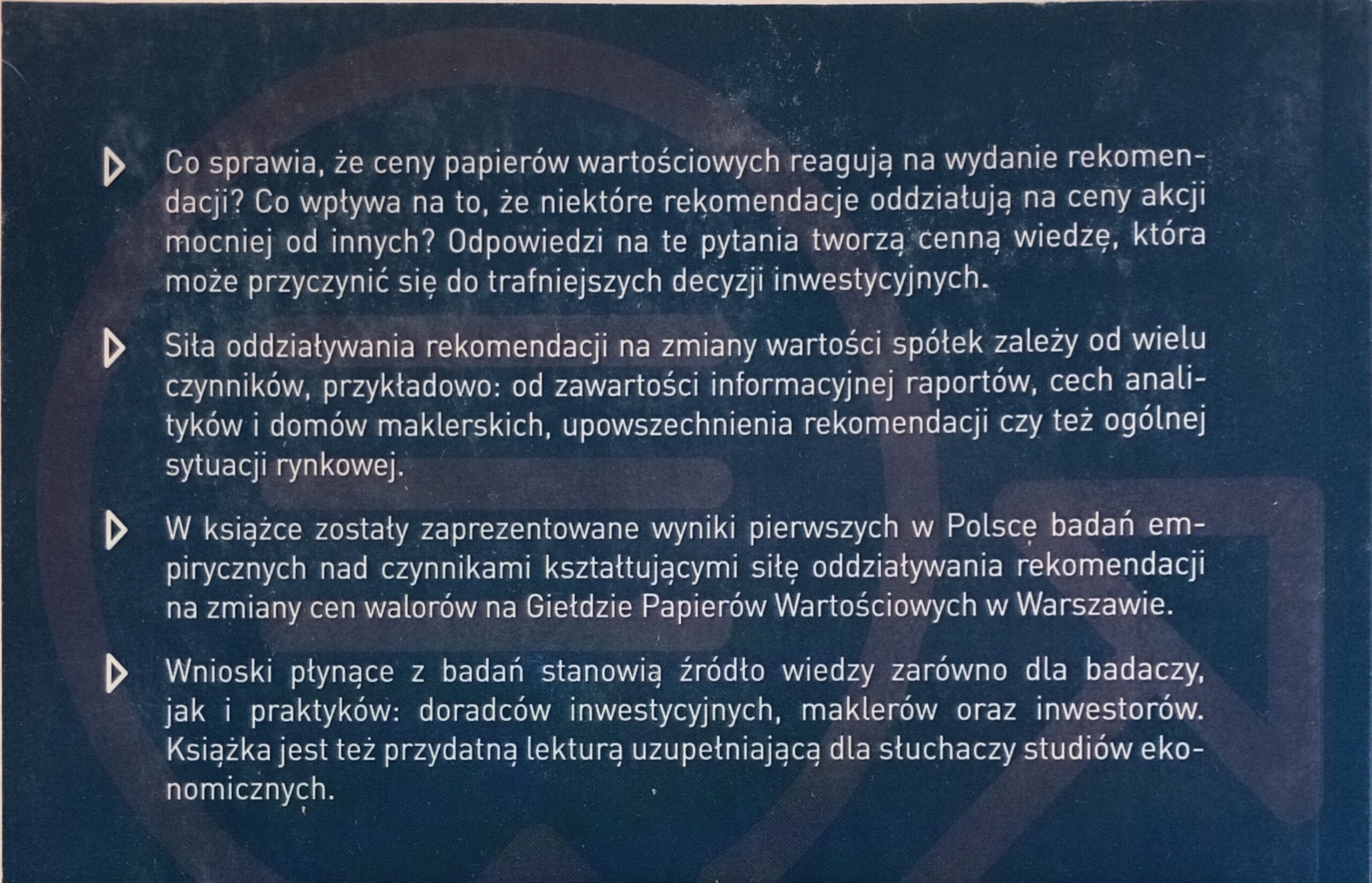 Pojawia się zatem pytanie o determinanty kształtujące skalę oddziaływania rekomendacji wydawanych dla spółek notowanych na GPW w Warszawie. Zgodnie z wiedzą autora w książce te po raz pierwszy w Polsce podjęto próbę znalezienia odpowiedzi na to pytanie.