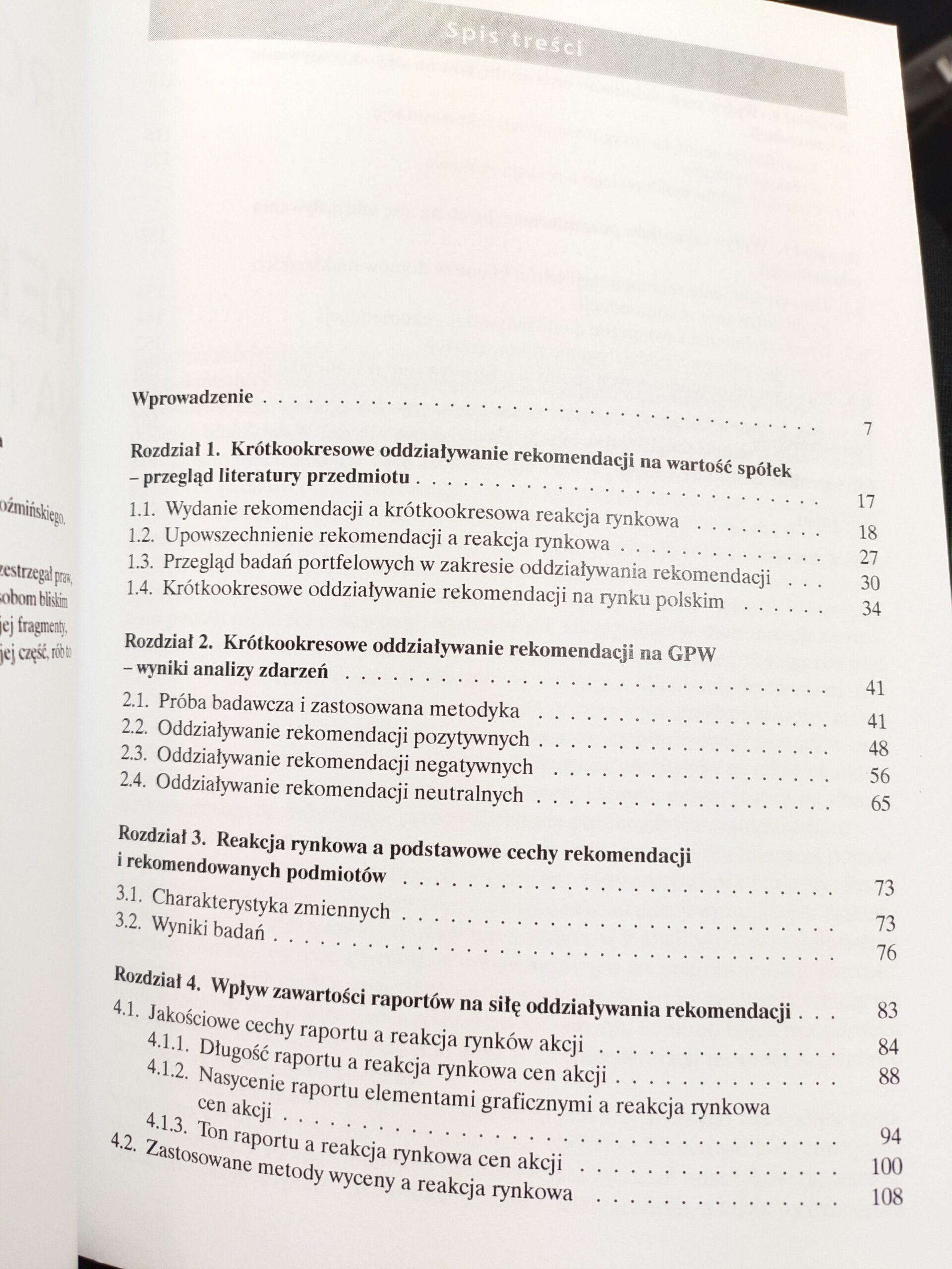 Rozdział 2 prezentuje wyniki badań własnych autora w zakresie pomiaru krótkookresowych reakcji rynkowych na fakt wydania rekomendacji na GPW w Warszawie.