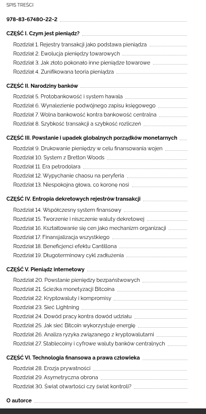 Dłuższy opis tematyki: Książka oferuje kompleksowe spojrzenie na pieniądz – od jego historycznych początków, poprzez mechanikę współczesnego systemu monetarnego, aż po pionierskie technologie mogące zmienić świat finansów.