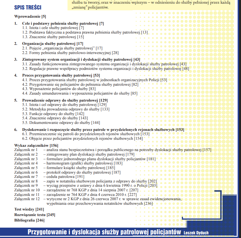 Lektura dostarcza pogłębionej wiedzy na temat prawidłowego umundurowania, wyposażenia oraz uzbrojenia niezbędnego do rzetelnego wykonywania obowiązków służbowych. Czytelnik poznaje procedury odprawy do służby oraz uczy się analizować czynniki wpływające na widoczność i dostępność patroli dla obywateli. Publikacja systematyzuje wiedzę o zapobieganiu zdarzeniom szkodliwym dla bezpieczeństwa publicznego poprzez precyzyjne wskazywanie miejsca i czasu prawdopodobnego wystąpienia zagrożeń.