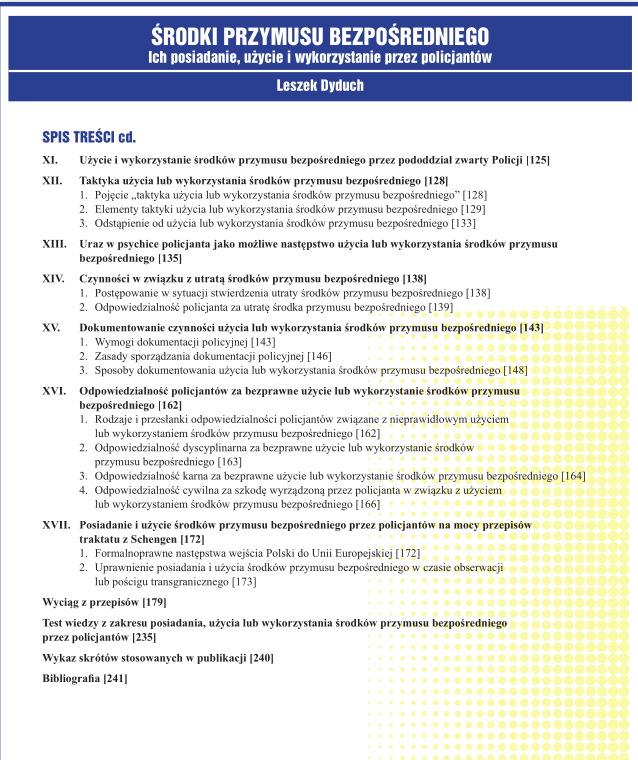 Książka Środki przymusu bezpośredniego: ich posiadanie, użycie i wykorzystanie przez Policjantów autorstwa Leszka Dyducha to kompleksowe opracowanie dydaktyczne wydane przez Centrum Szkolenia Policji w Legionowie. Publikacja stanowi kluczowy element samokształcenia funkcjonariuszy, koncentrując się na korelacji między fizyczną skutecznością interwencji a ścisłym zachowaniem bezpieczeństwa prawnego. Autor, jako doświadczony dydaktyk, systematyzuje wiedzę o ŚPB, uwzględniając najnowsze standardy ochrony praw człowieka.